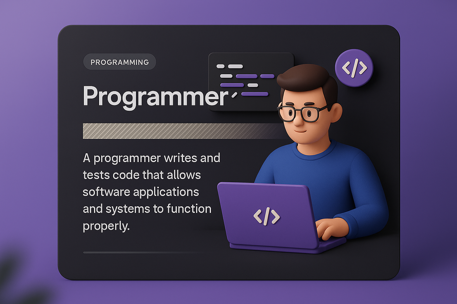 /Collection: /by davooda/Type: PNG/A creative 3D illustration showcasing a programmer working at a laptop. The design includes a dark panel with text and graphics, integrating visual elements seamlessly.