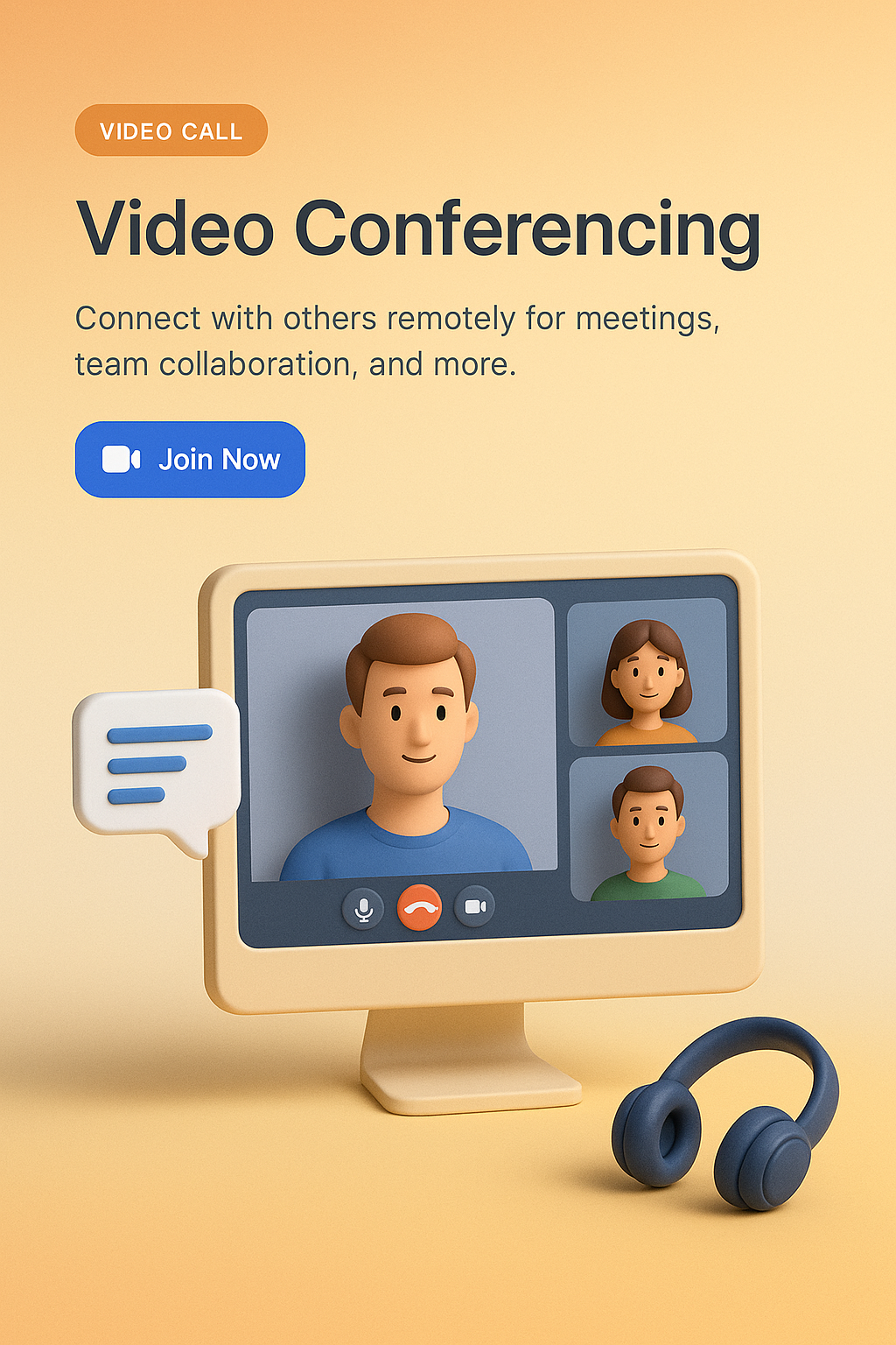 /Collection: /by davooda/Type: PNG/A detailed 3D illustration depicting a video conferencing setup on a monitor. The scene includes animated characters in a call, a chat bubble, and headphones, set against a smooth gradient background.