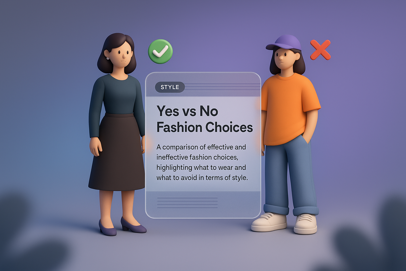 A 3D illustration depicting a comparison of fashion choices. One character represents effective style, and the other, ineffective. The background features a smooth gradient.