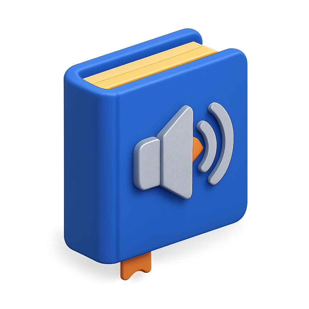 A vibrant 3D icon featuring a blue book with a speaker symbol, designed in an isometric view. The icon showcases a modern, volumetric style suitable for audio-related content.