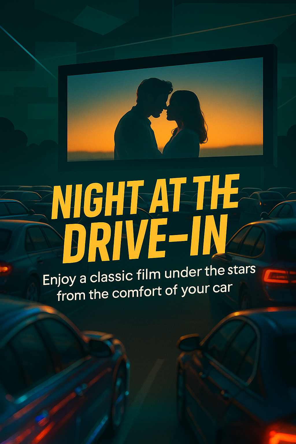 Vibrant promotional graphic for a drive-in movie event featuring a romantic scene and cinematic elements. Ideal for event marketing or social media.