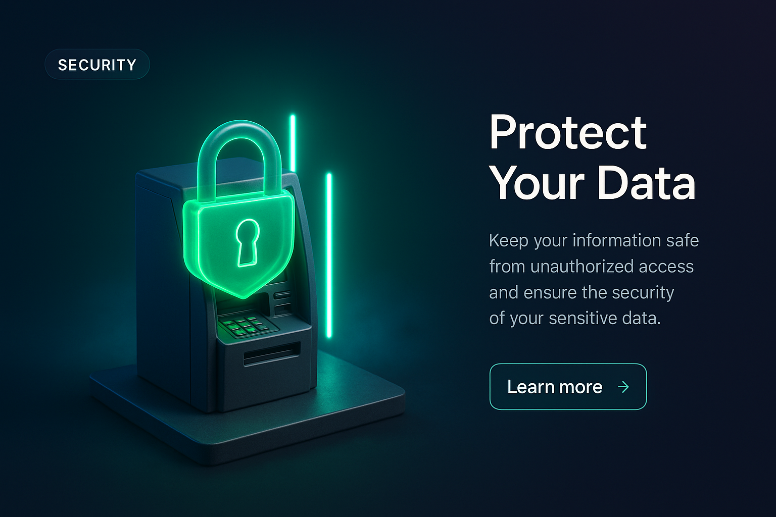 A vibrant 3D scene featuring a glowing security lock on an ATM. The background is dark with neon accents and fog, creating a mysterious atmosphere. Text elements highlight data protection.