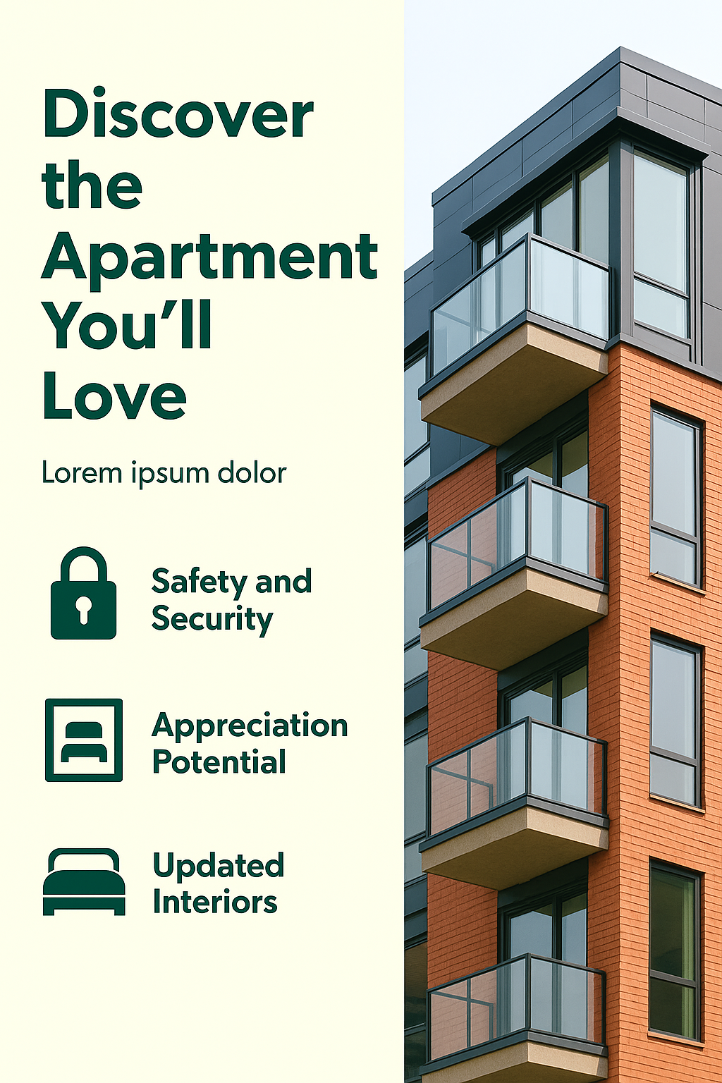 /Collection: /by davooda/Type: PNG/Promotional graphic for an apartment listing, showcasing key features such as safety, appreciation potential, and updated interiors with a modern design suitable for real estate marketing.