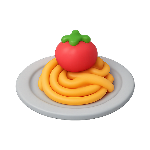 A playful 3D representation of spaghetti topped with a stylized tomato, featuring bright colors and a fun design. Ideal for food-related graphics or children's content.