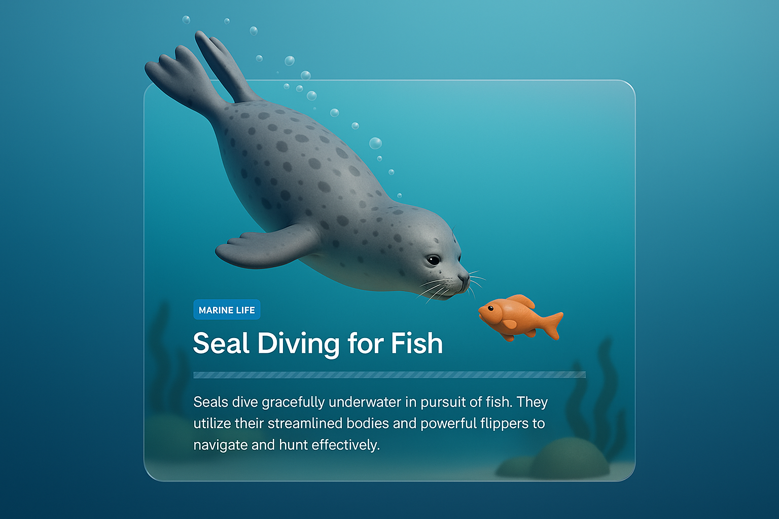 A 3D illustration of a seal diving underwater in pursuit of fish, showcasing its streamlined body and flippers amidst a serene marine environment.
