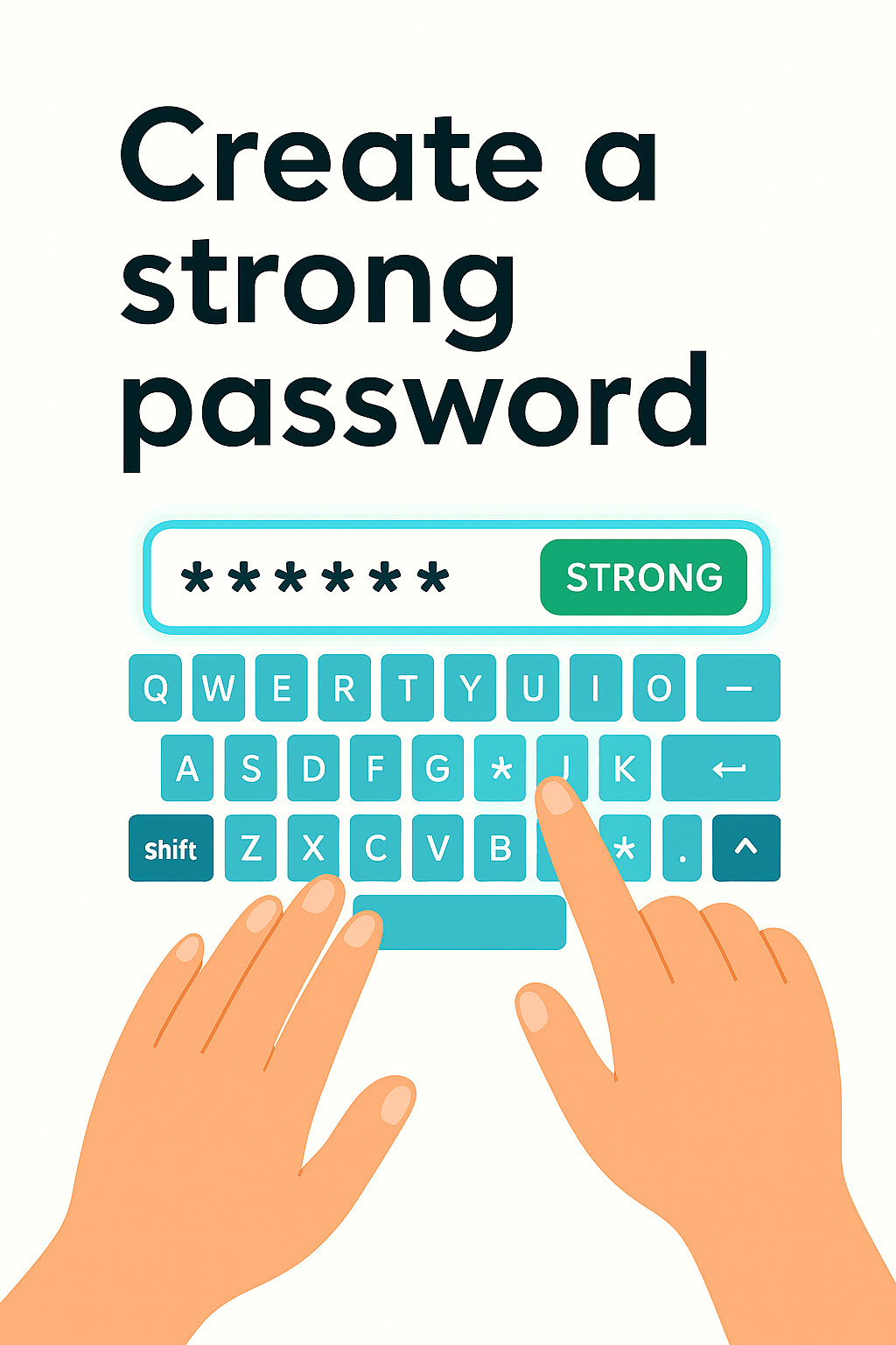 /Collection: /by davooda/Type: PNG/Illustrative graphic focusing on the importance of creating strong passwords, featuring hands typing on a keyboard. Ideal for cybersecurity awareness campaigns.