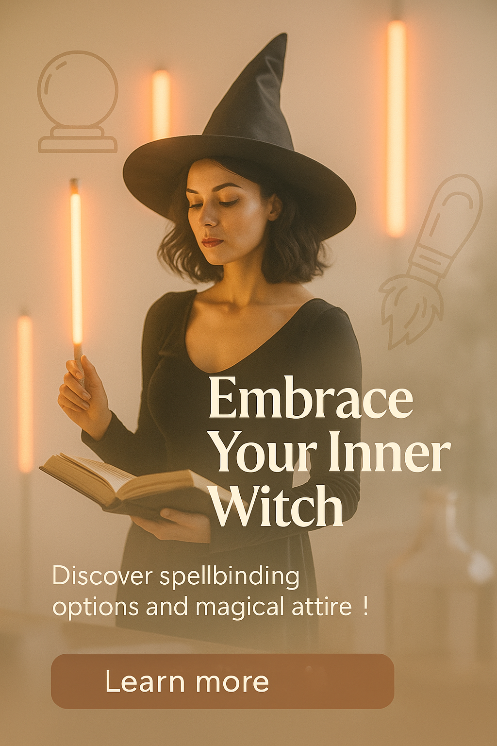 /Collection: /by davooda/Type: PNG/A visually captivating LinkedIn carousel slide featuring a witch with glowing neon elements, inviting viewers to explore magical attire and options. The design balances realism with engaging aesthetics.