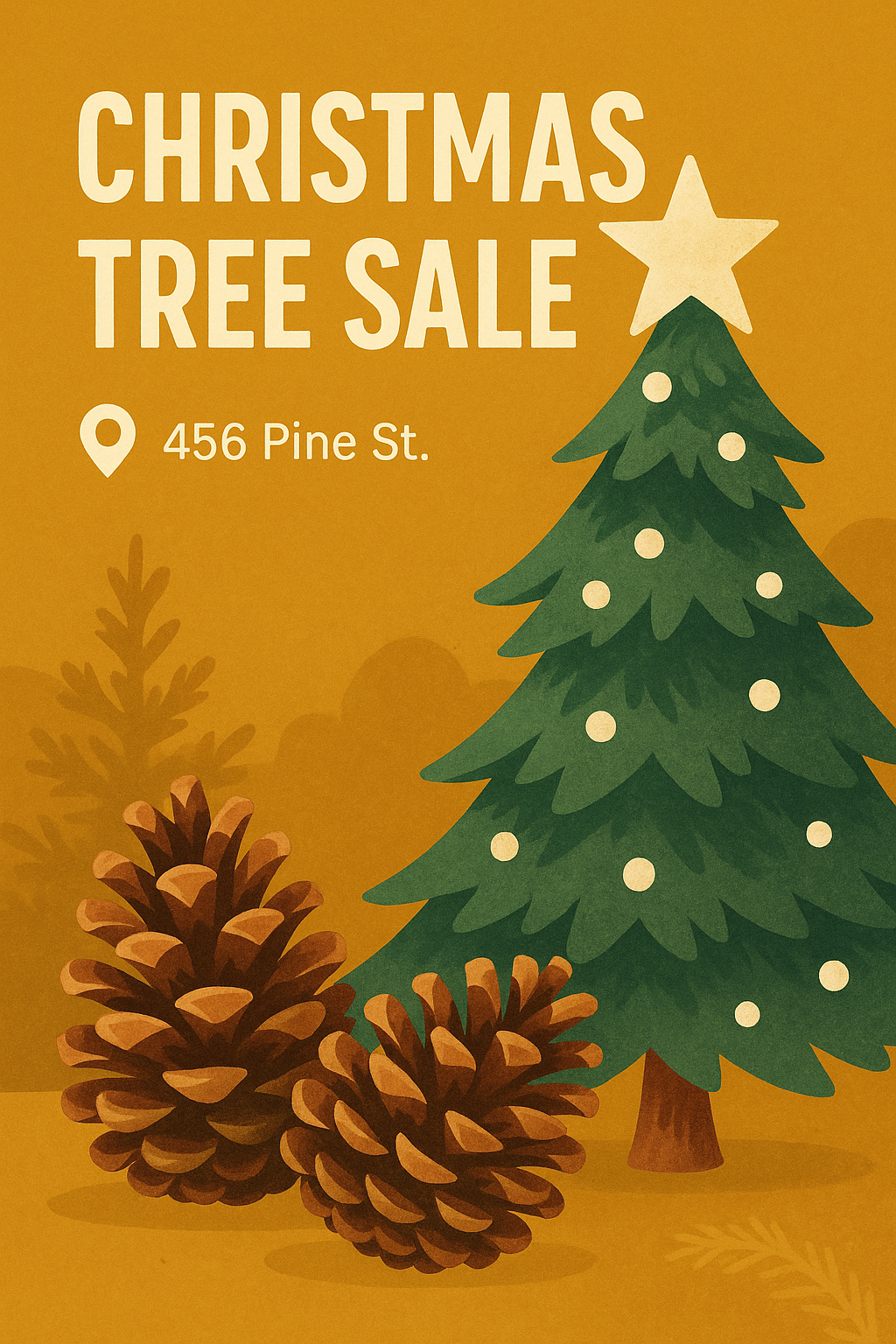 /Collection: /by davooda/Type: PNG/Cheerful promotional graphic featuring a decorated Christmas tree and pine cones, ideal for local holiday marketing. The warm color palette enhances the festive theme.