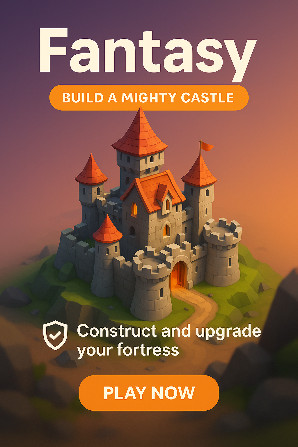 /Collection: /by davooda/Type: PNG/Vibrant game promotional graphic showcasing a detailed castle design, aimed at attracting players for a fantasy-building game. Ideal for app store or social media advertising.