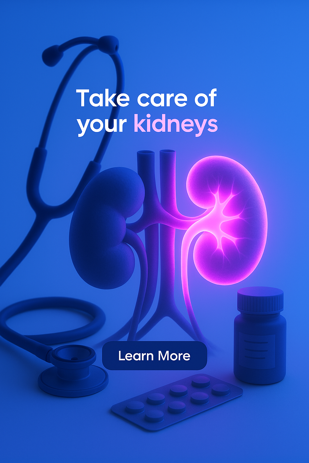 A vibrant composition featuring neon pink glowing kidneys against a solid blue background. The scene includes a stethoscope, medicine bottle, and pills, emphasizing kidney health.