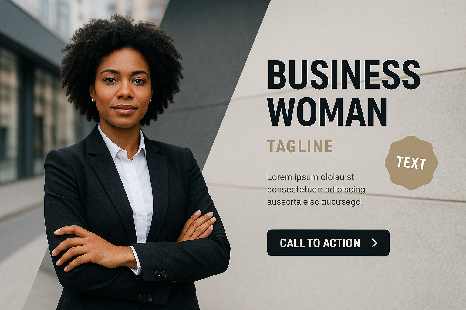 /Collection: /by davooda/Type: PNG/A confident Afro businesswoman in a suit, arms crossed, positioned against a modern architectural backdrop. The design features a clear hierarchy, contrasting colors, and a call-to-action button.