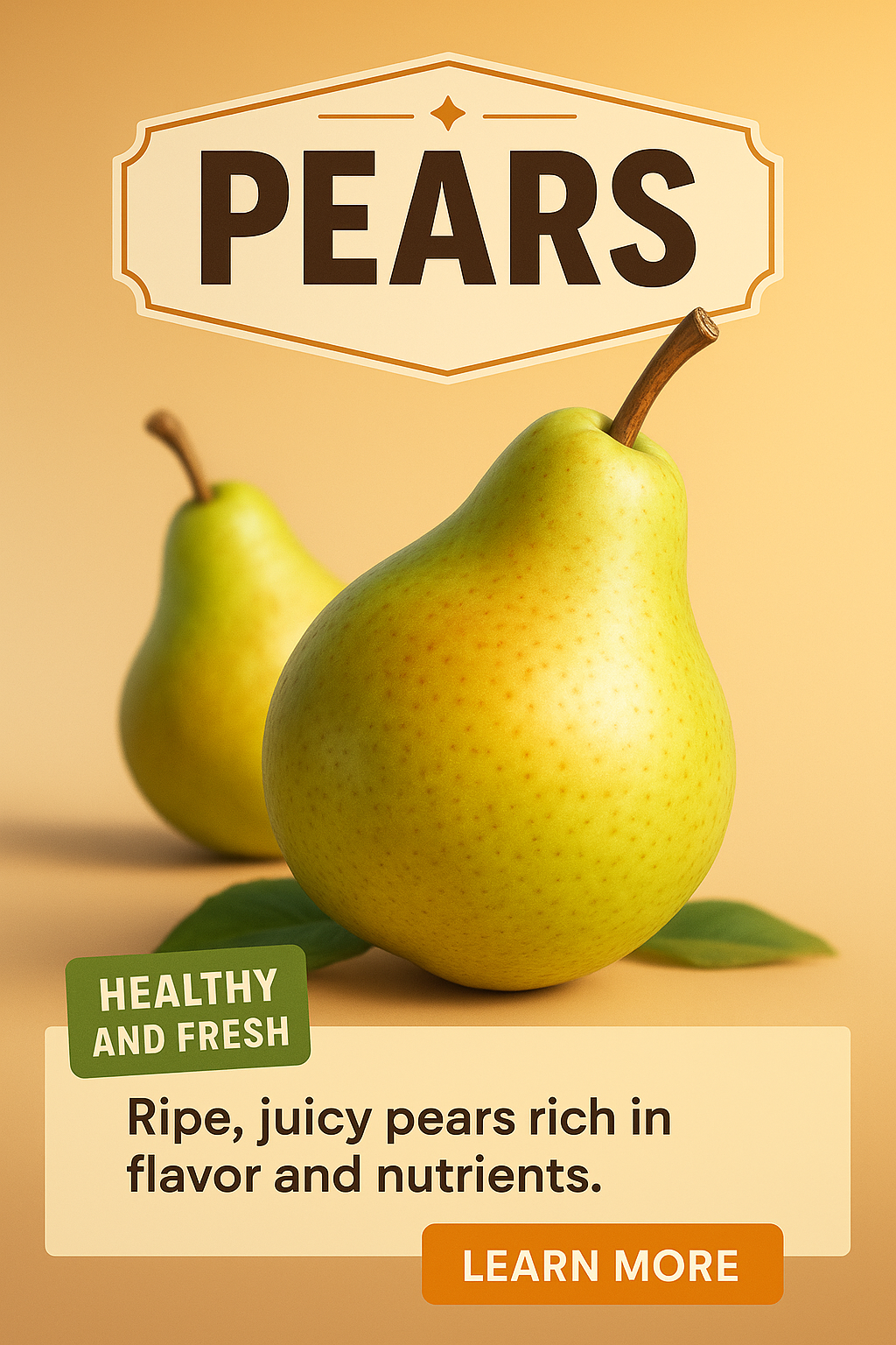 This is a promotional graphic featuring ripe pears, designed to highlight their health benefits. The warm color palette and simple layout appeal to health-conscious consumers.