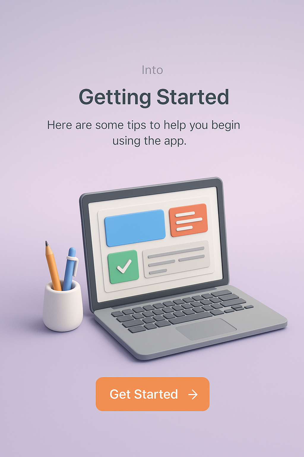 /Collection: /by davooda/Type: PNG/A detailed 3D illustration featuring a laptop displaying tips for app usage, surrounded by a simple gradient background. The design is zoomed out, showcasing a cohesive layout.