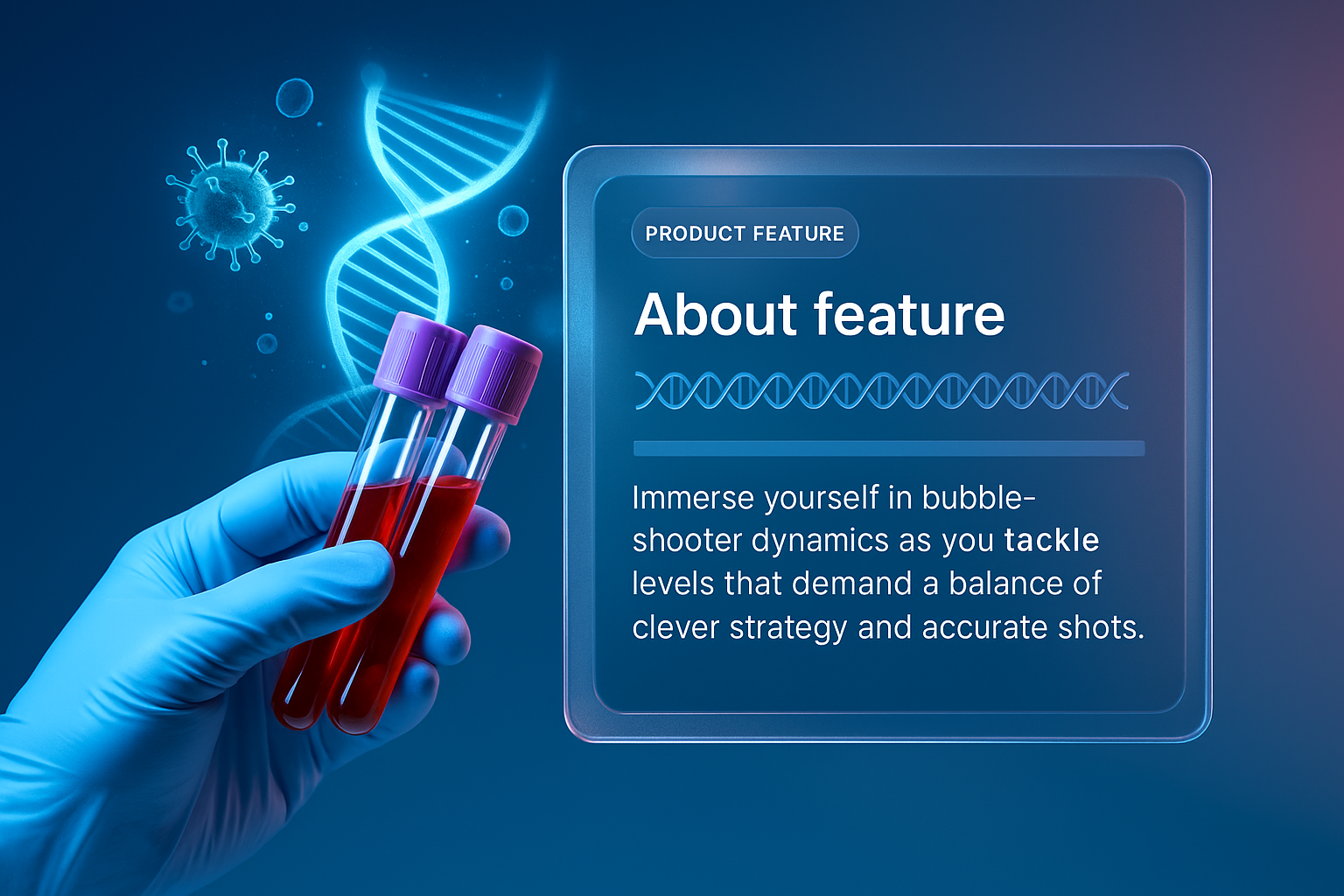 /Collection: /by davooda/Type: PNG/A scientist's hand holds test tubes filled with red liquid, symbolizing medical research. In the background, DNA strands and virus icons are displayed, creating a high-tech atmosphere.