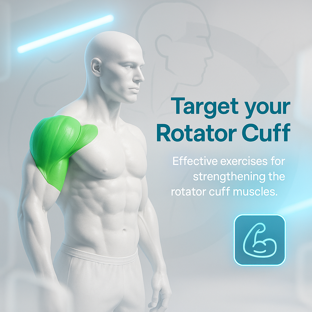 /Collection: /by davooda/Type: PNG/A modern 3D illustration focusing on rotator cuff exercises, showcasing a muscular figure with a highlighted shoulder area. Ideal for fitness and rehabilitation contexts.