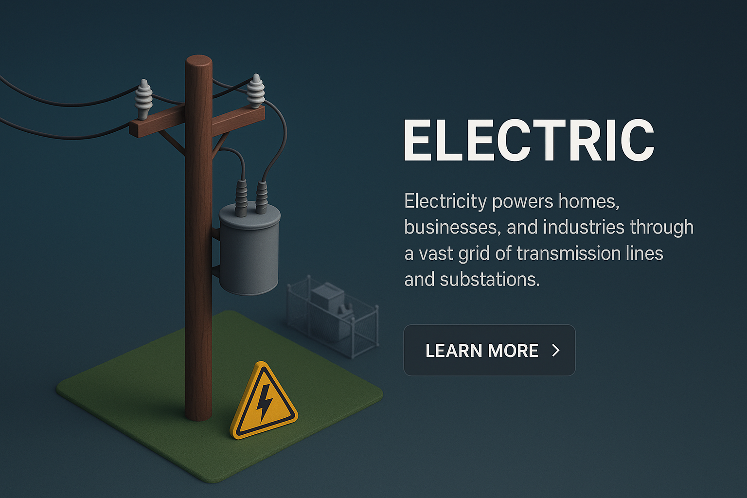/Collection: /by davooda/Type: PNG/A realistic 3D scene featuring an electric power pole with wires and a transformer. The background is dark with a smooth gradient, and text elements highlight the role of electricity in homes and businesses.