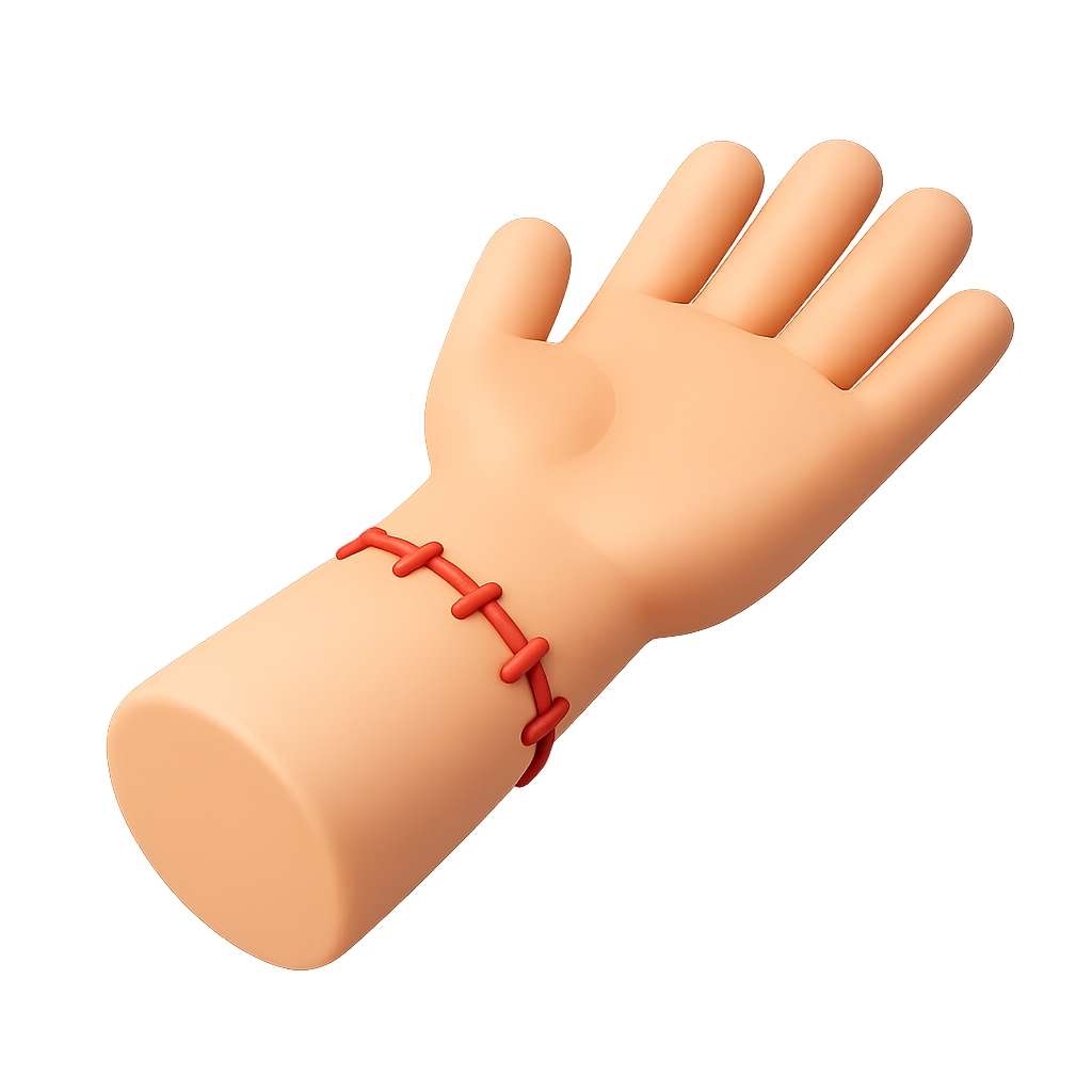 A stylized 3D icon depicting a hand with a rounded wrist and red stitching detail. The design is simplistic and modern, suitable for various digital applications.