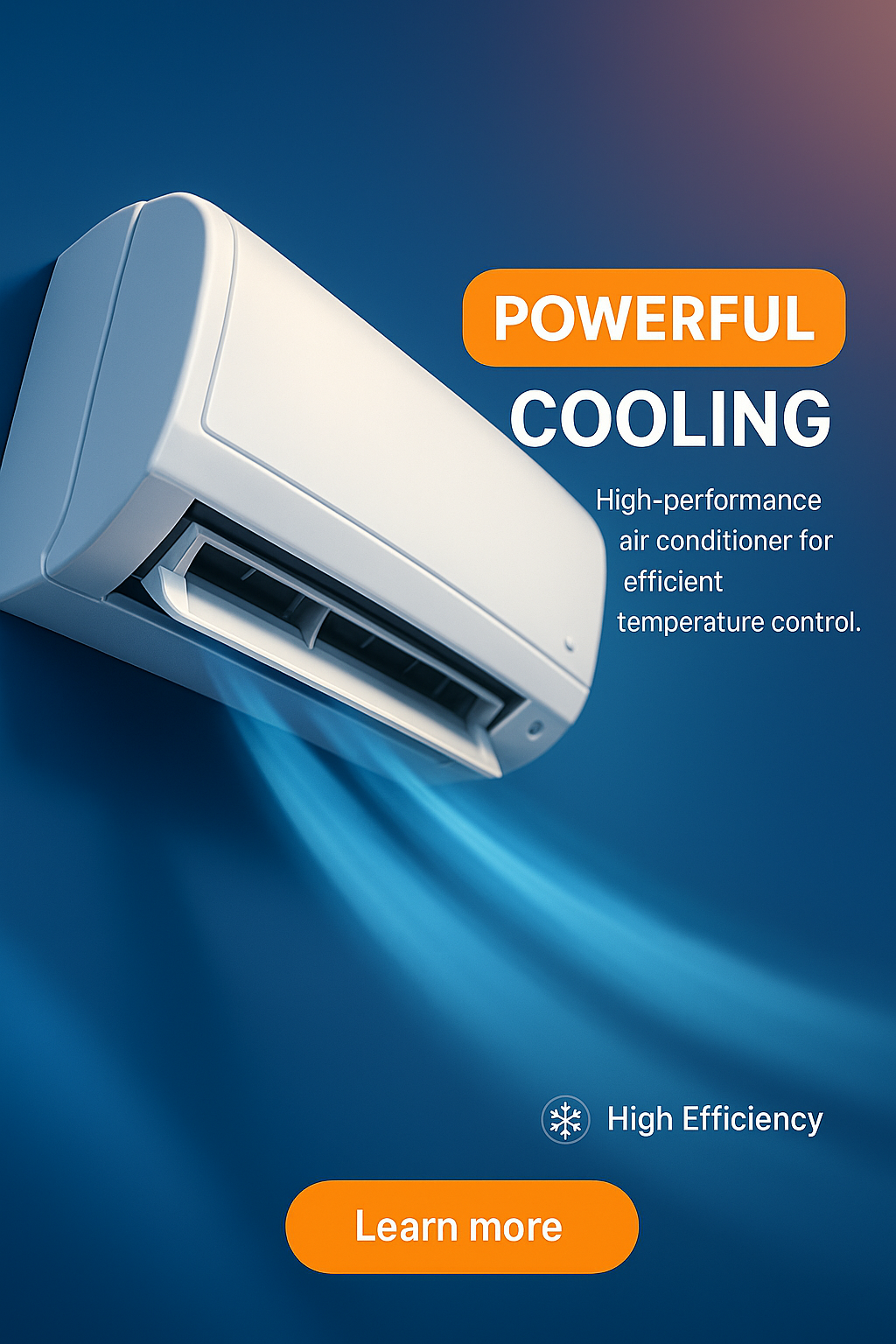 /Collection: /by davooda/Type: PNG/This is a promotional graphic showcasing a high-performance air conditioner with a focus on its cooling capabilities. The design features a modern aesthetic with a blue background and vibrant text.