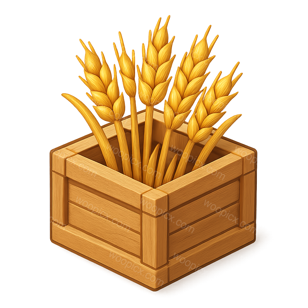 A 3D illustration of golden wheat stalks arranged in a wooden box, showcasing an isometric view with a volumetric effect against a gradient background.