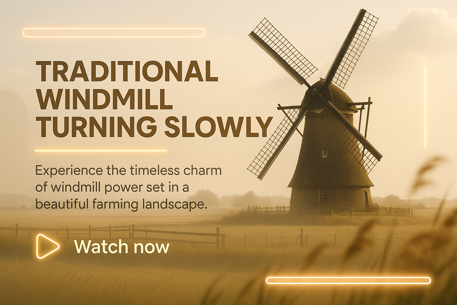 Scenic image of a traditional windmill set in a serene farming landscape, featuring soft lighting and inviting tones, ideal for nature-themed content.