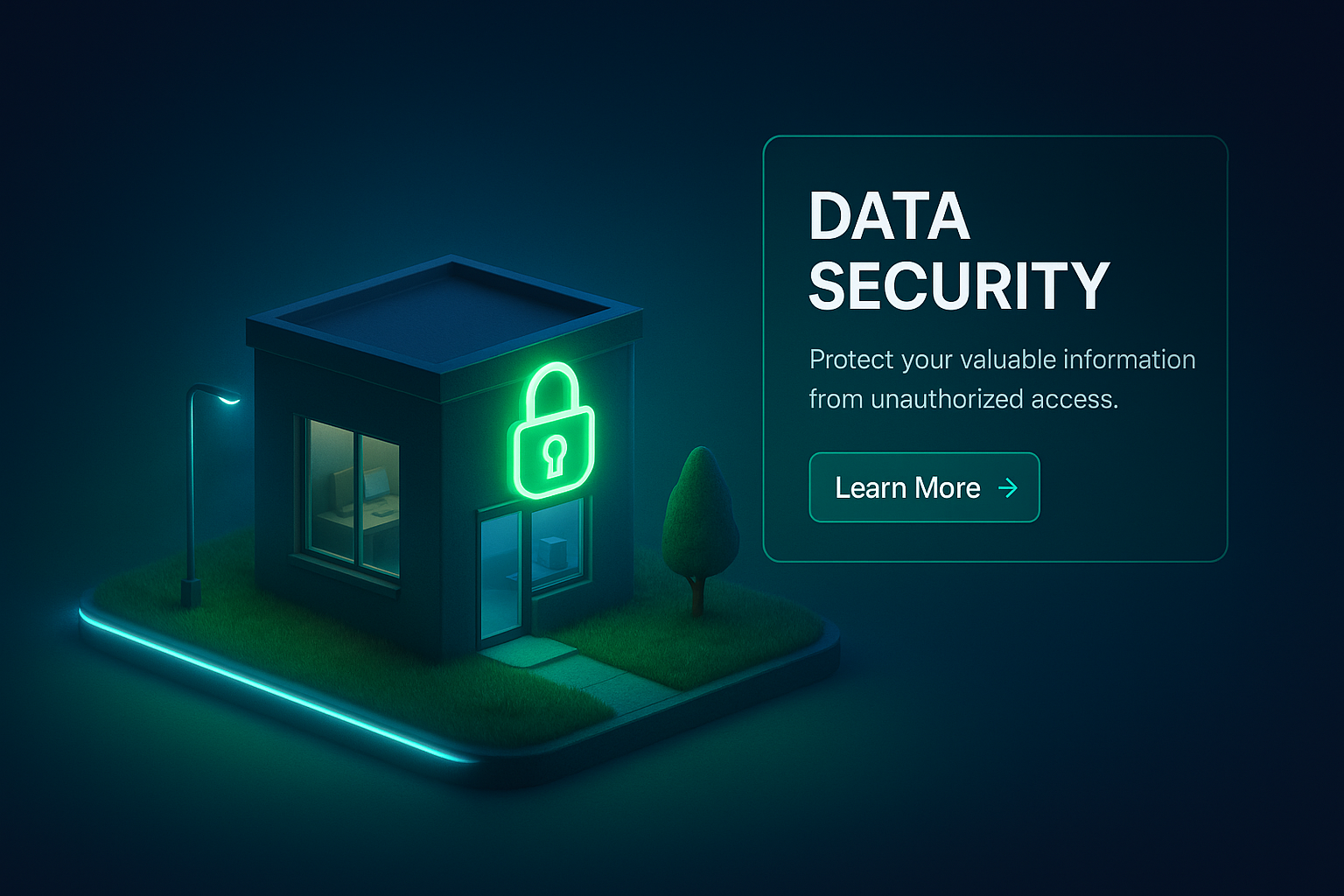 /Collection: /by davooda/Type: PNG/A 3D scene featuring a small house illuminated by neon lights, emphasizing data security. The dark background enhances the vibrant lights, creating a soft halo effect around the elements.