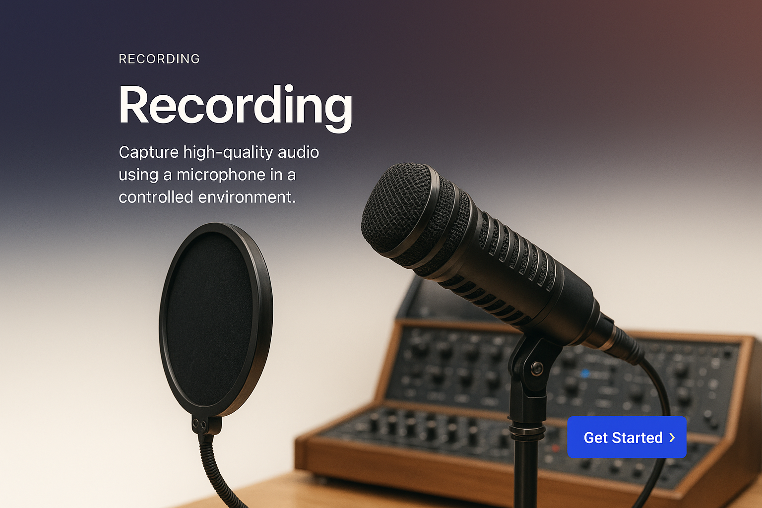 A sleek web design featuring a microphone setup for audio recording. The layout includes a gradient background, a prominent title, a brief text description, and an action button.