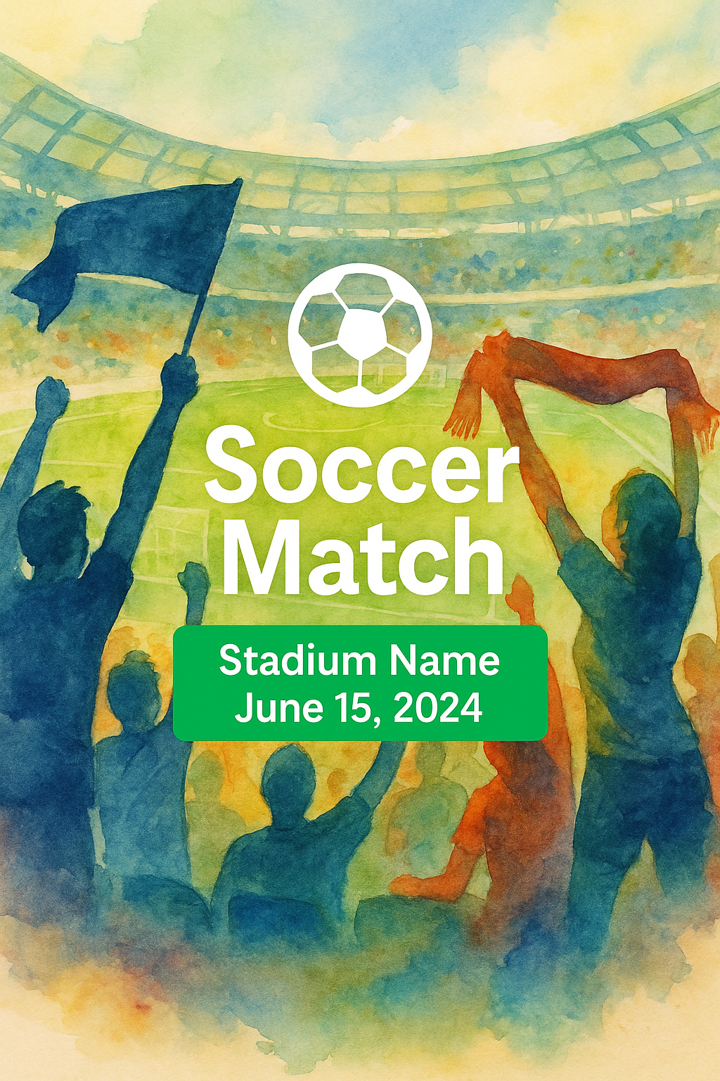 Vibrant watercolor-style graphic announcing a soccer match, featuring enthusiastic fans in a stadium setting, suitable for event promotion.