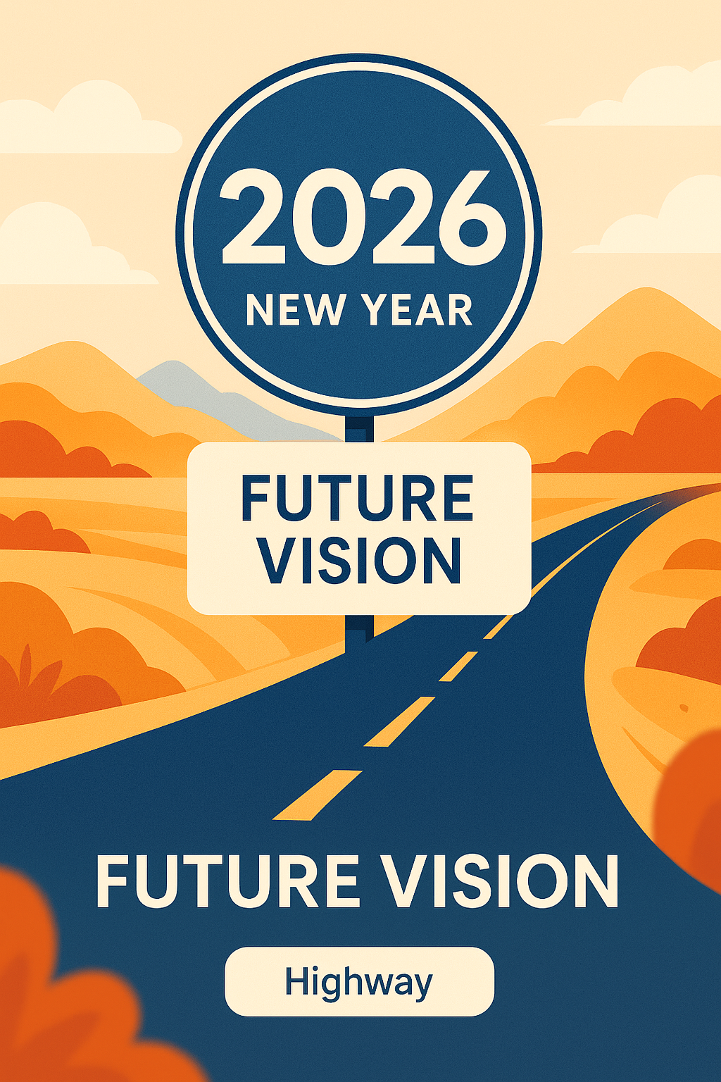 /Collection: /by davooda/Type: PNG/A vibrant graphic depicting a stylized road sign for New Year 2026, featuring warm colors and a scenic highway background. Ideal for promotional materials and social media posts celebrating new beginnings.
