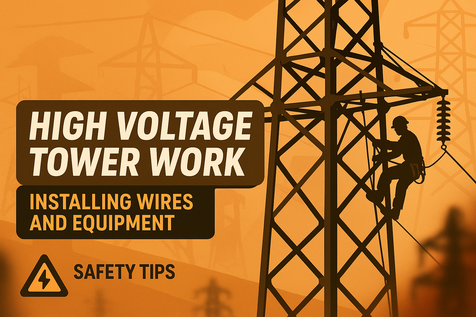 Informative graphic illustrating safety tips for high voltage tower work, featuring a silhouette of a worker and a bold color scheme. Ideal for training or safety awareness materials.