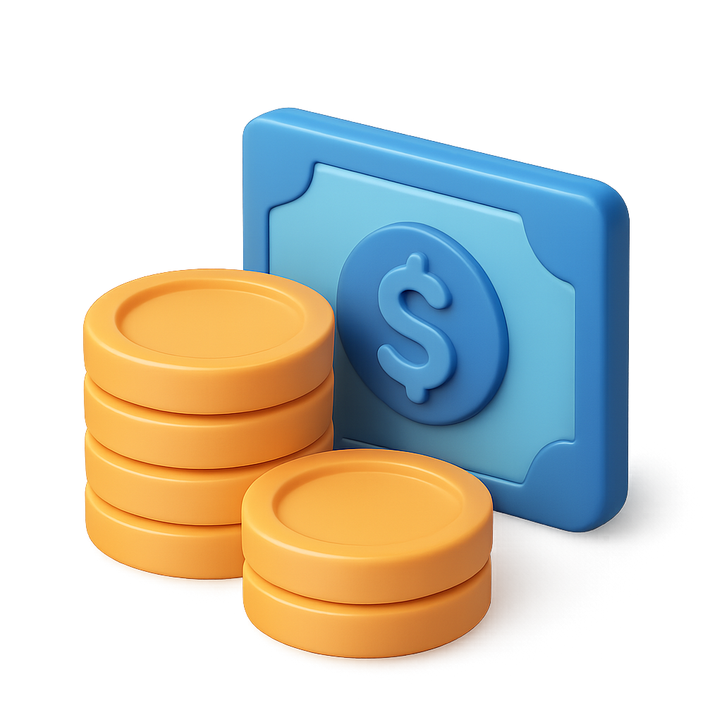 A visually striking 3D icon featuring a stack of orange coins next to a blue banknote, all set against a gradient background. The isometric view enhances the depth and volumetric feel of the design.