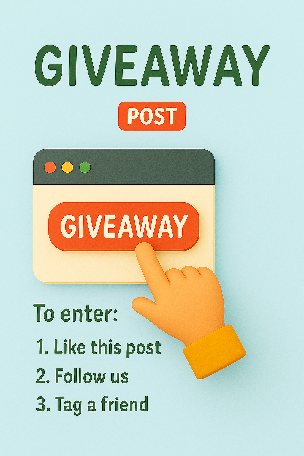 /Collection: /by davooda/Type: PNG/Engaging 3D graphic designed for a social media giveaway promotion, featuring a hand interacting with a 'Giveaway' button. Ideal for increasing engagement and followers.