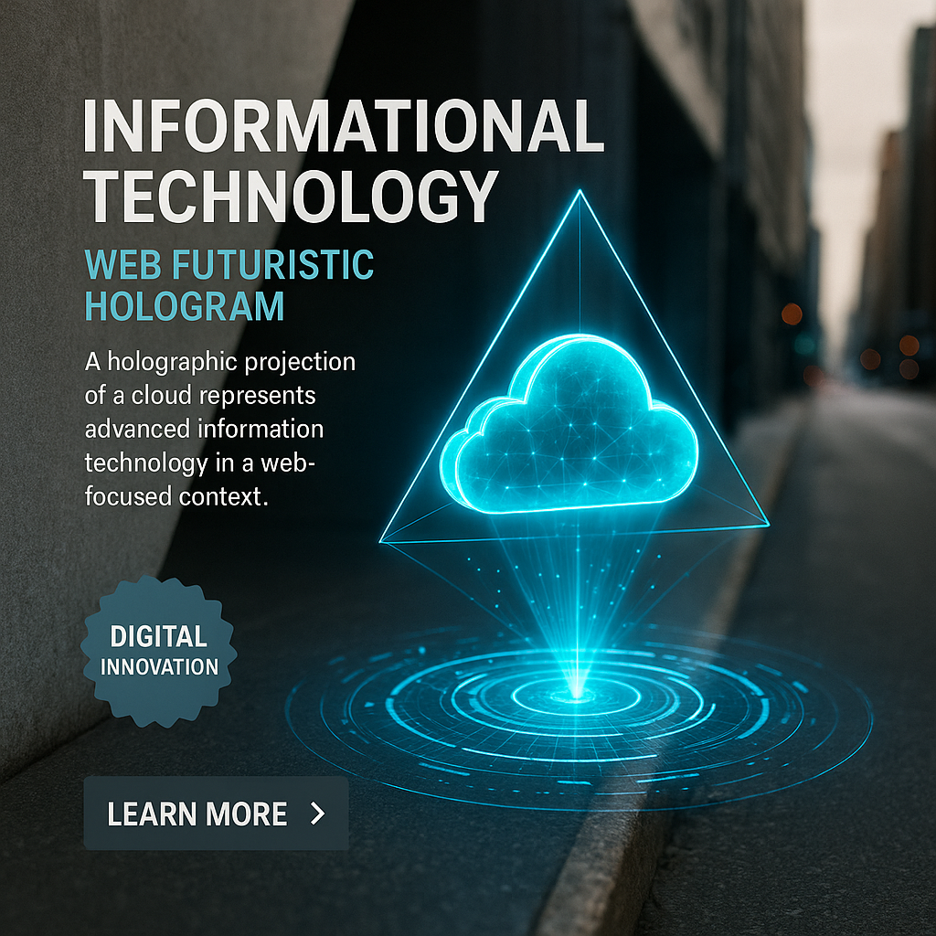 /Collection: /by davooda/Type: PNG/A striking holographic representation of a cloud symbolizes advanced information technology, set against a modern urban backdrop, featuring clear text elements.
