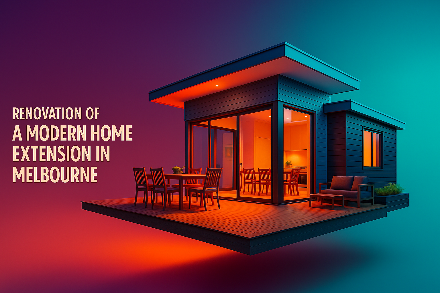 /Collection: /by davooda/Type: PNG/A stunning modern home extension in Melbourne featuring a vibrant deck and patio area. The dynamic lighting enhances the architectural details, creating an inviting atmosphere.