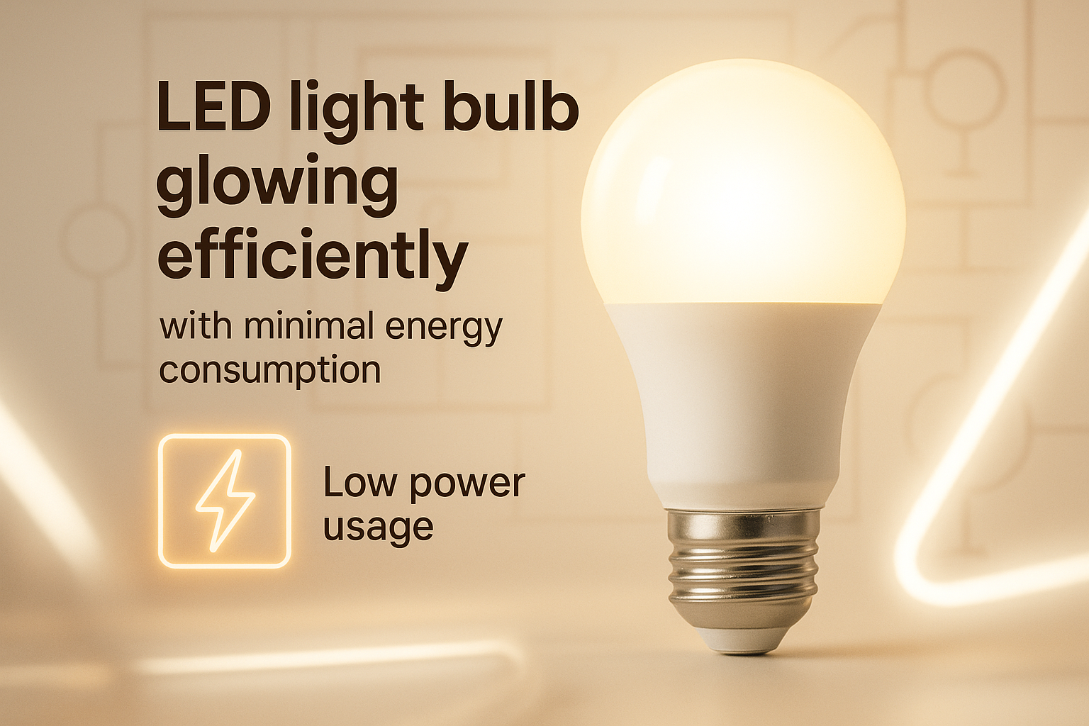 A modern promotional graphic showcasing an LED light bulb emphasizing energy efficiency and low power usage, ideal for eco-friendly product marketing.