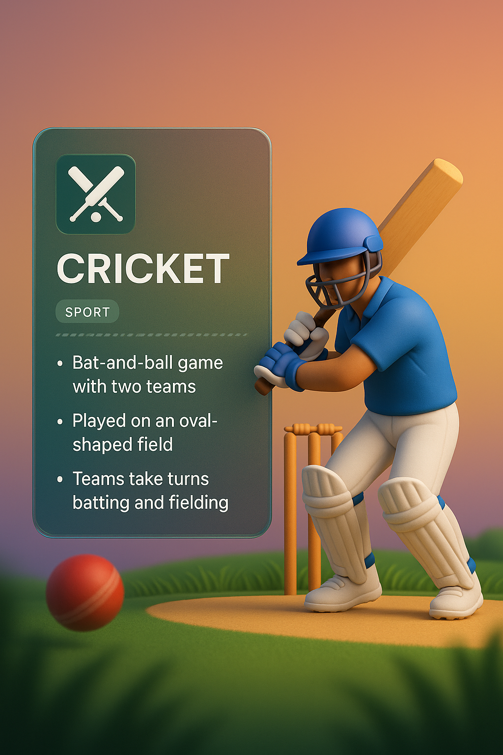 /Collection: /by davooda/Type: PNG/A vibrant 3D illustration of a cricket player poised to bat, with an integrated information panel detailing the sport's rules. The background features a smooth gradient transitioning from warm to cool tones.