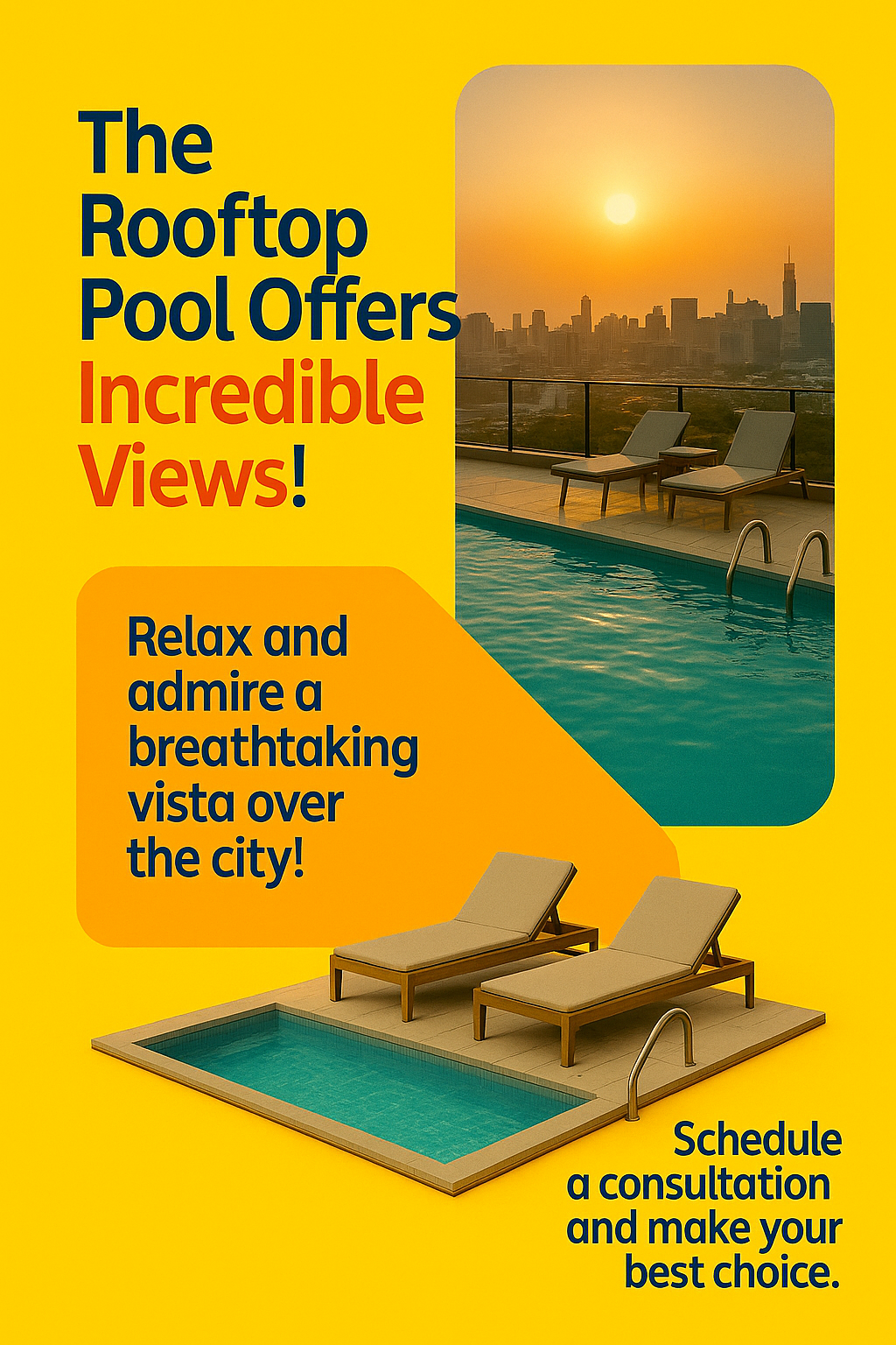 Vibrant promotional graphic showcasing a rooftop pool experience with city skyline views, designed to attract visitors to a luxurious relaxation spot.