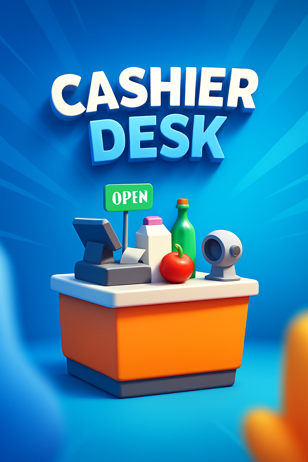 A vibrant 3D illustration of a cashier desk featuring various items like a register, drinks, and a tomato, set against a smooth gradient background. The scene is lively and colorful.