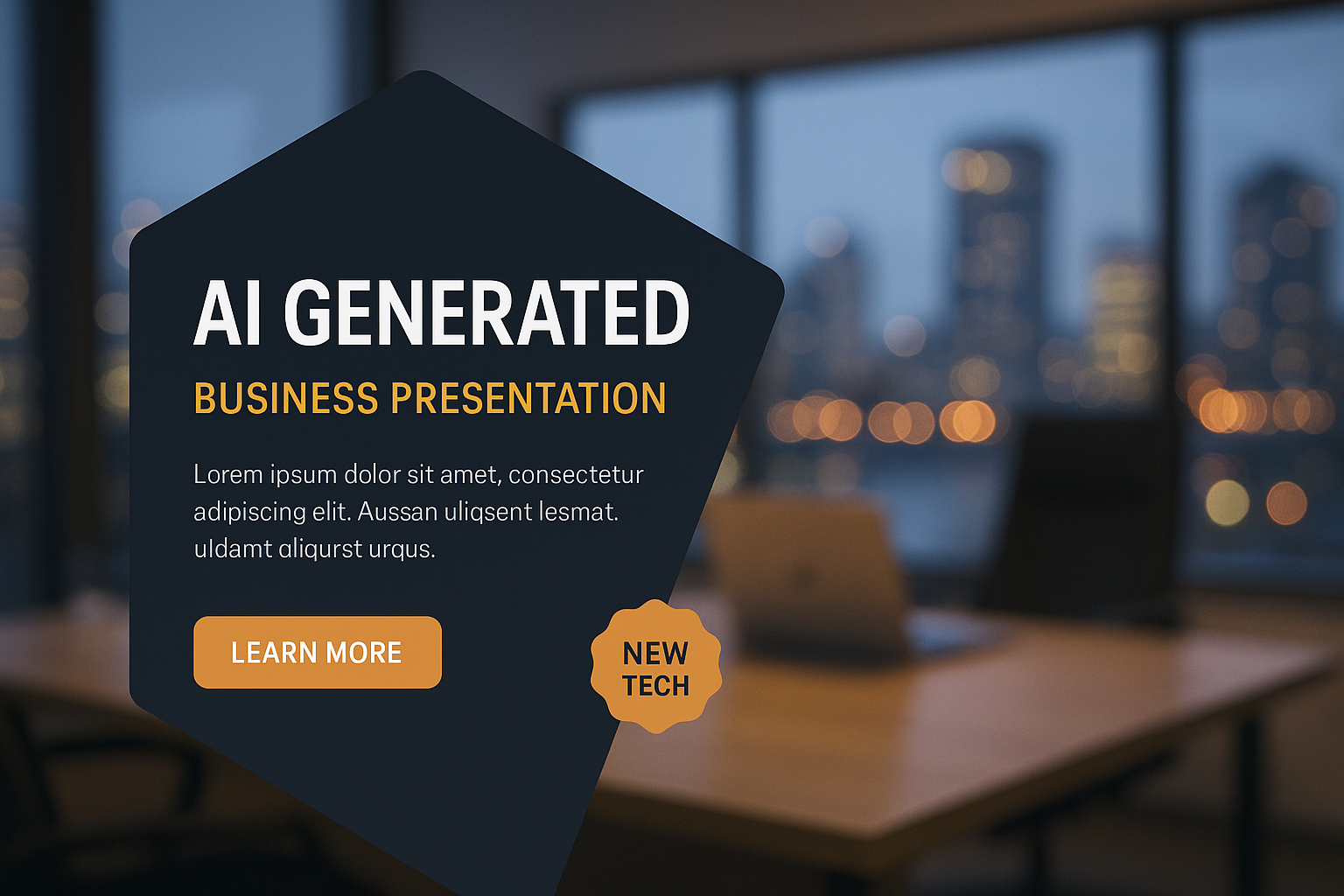 /Collection: /by davooda/Type: PNG/A blurred office workspace in the evening, featuring a cityscape backdrop. The design includes a prominent text block about AI generation, with a modern aesthetic and a call-to-action button.