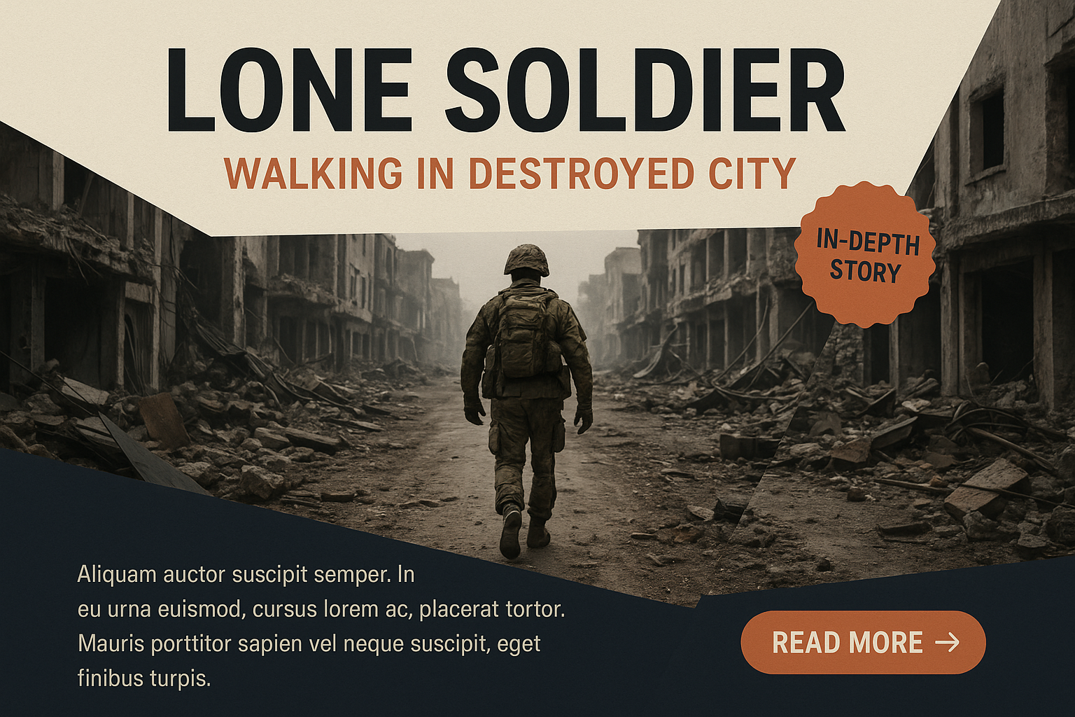 A lone soldier traverses a devastated urban landscape, showcasing a powerful visual narrative. The layered composition highlights the soldier amidst destroyed buildings, evoking a sense of resilience.