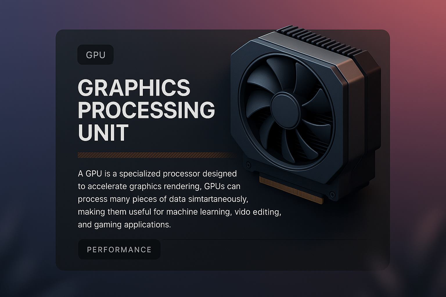 This image features a 3D illustration of a GPU with a dark panel integrated into its design, showcasing performance details and key features in a cohesive layout.