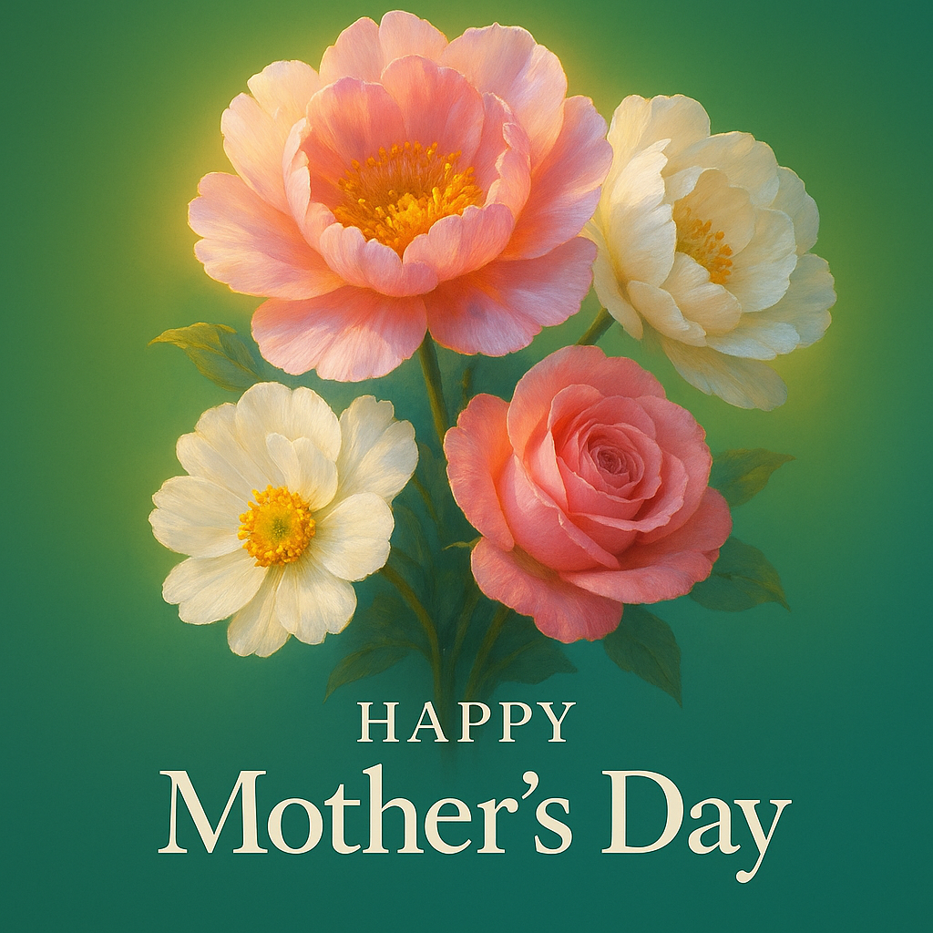 /Collection: /by davooda/Type: PNG/A stunning illustration of vibrant flowers, including peonies and daisies, set against a smooth green background. The text 'Happy Mother's Day' is elegantly displayed.