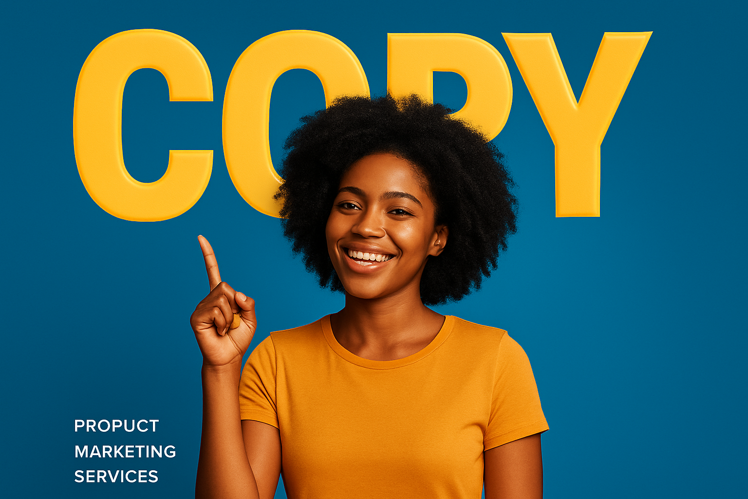 /Collection: /by davooda/Type: PNG/A beautiful young black woman smiles joyfully while pointing upwards, set against a blue background. The image features bold typography, emphasizing the word 'COPY' above her, creating a striking visual for advertising.
