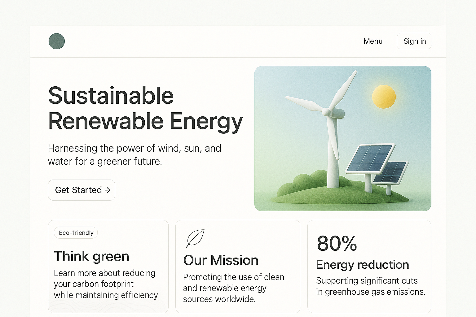 /Collection: /by davooda/Type: PNG/A minimalist landing page design featuring a 3D illustration of wind turbines and solar panels. The layout includes eco-friendly text elements and interactive buttons.