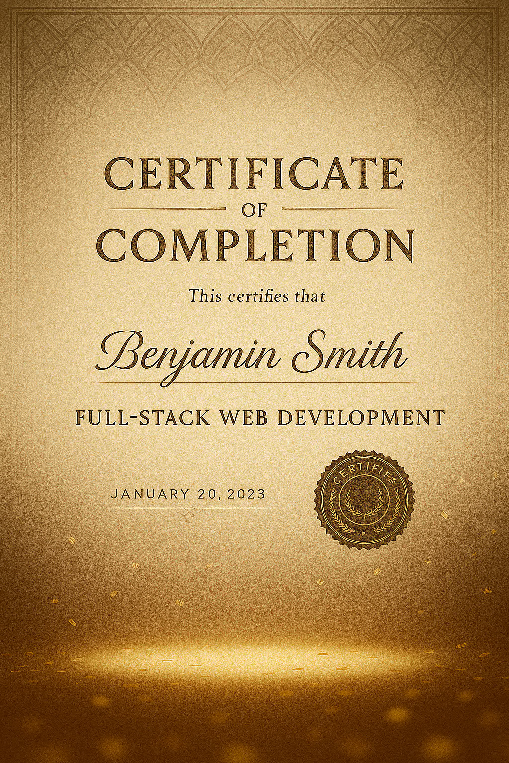 /Collection: /by davooda/Type: PNG/Formal certificate design featuring a sophisticated layout, ideal for recognizing achievements in web development courses. The gold and cream color scheme adds a touch of elegance.