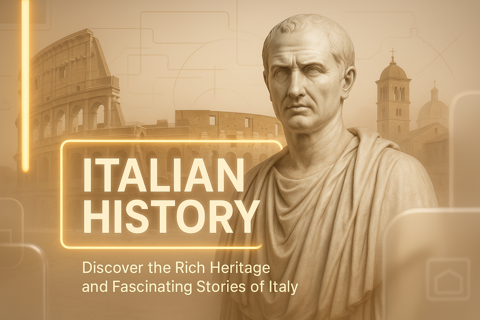 /Collection: /by davooda/Type: PNG/A visually appealing infographic showcasing Italian history, featuring a statue and architectural elements. Ideal for educational content and cultural presentations.