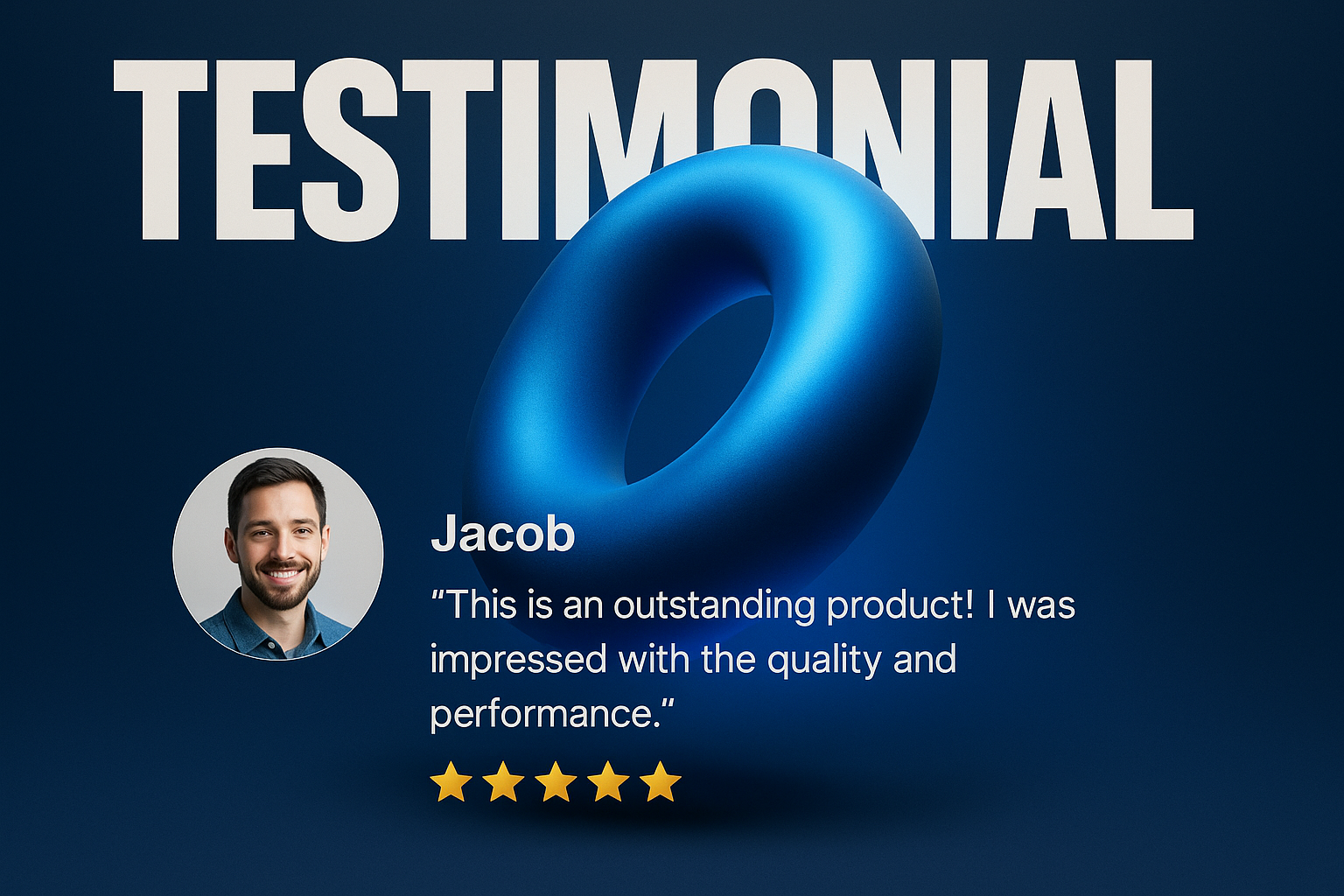 /Collection: /by davooda/Type: PNG/A modern testimonial layout featuring a circular photo, a large blue 3D object, and a bold headline. Includes a 5-star rating and elegant text elements.