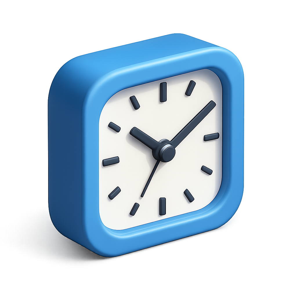 A modern 3D clock icon featuring a blue rounded square frame, white clock face, and black hour and minute hands, presented in an isometric view.