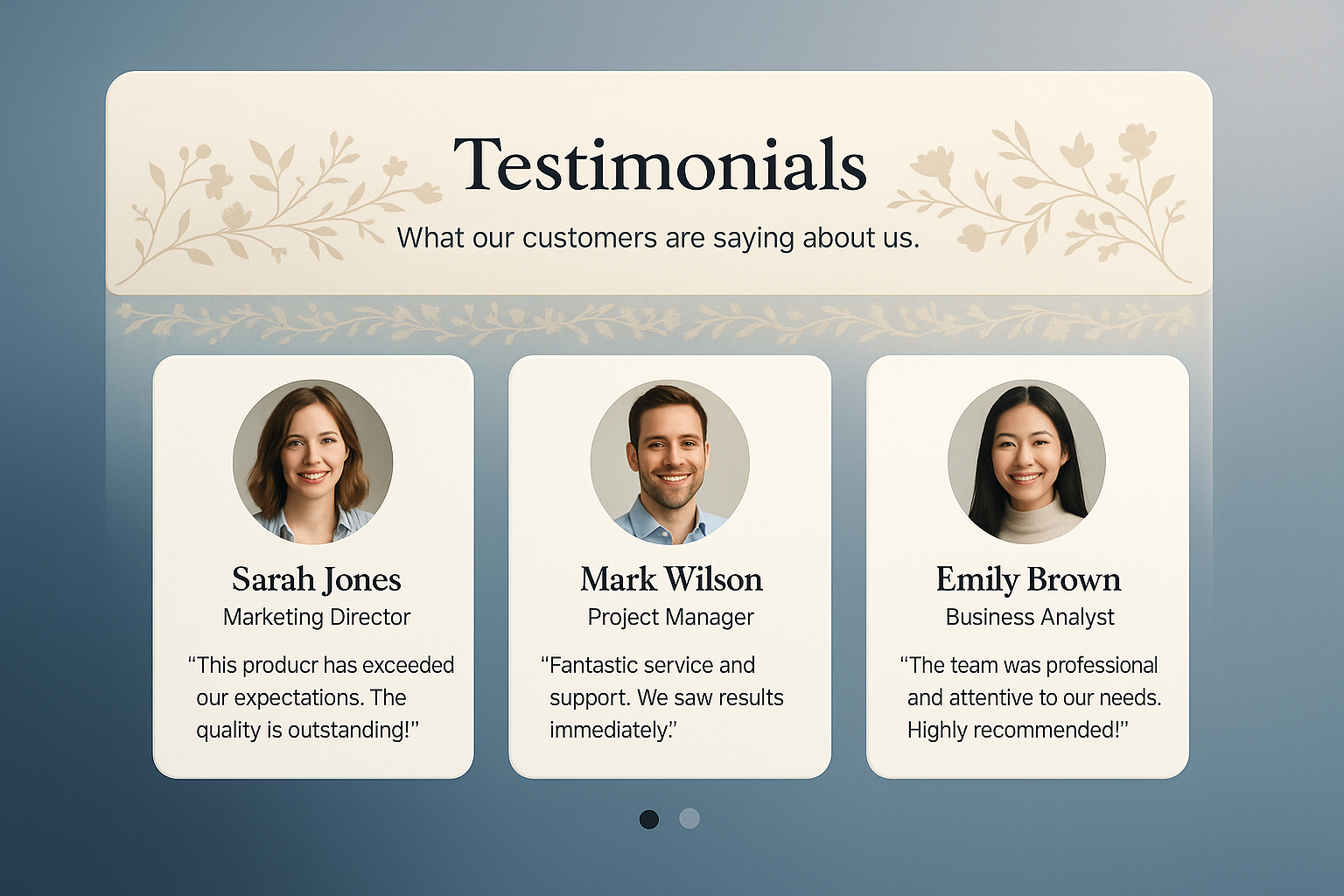 /Collection: /by davooda/Type: PNG/A beautifully designed testimonials section featuring three cards with circular author photos, names, positions, and quotes. Floral frames enhance elegance.
