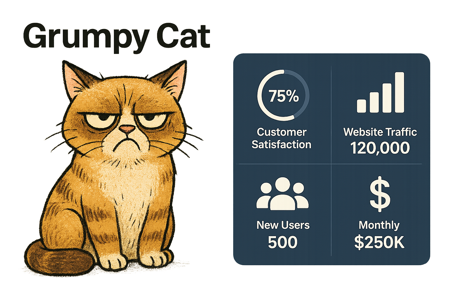 /Collection: /by davooda/Type: PNG/A playful infographic combining a cartoon illustration of Grumpy Cat with key business metrics, suitable for engaging audiences in marketing or social media contexts.
