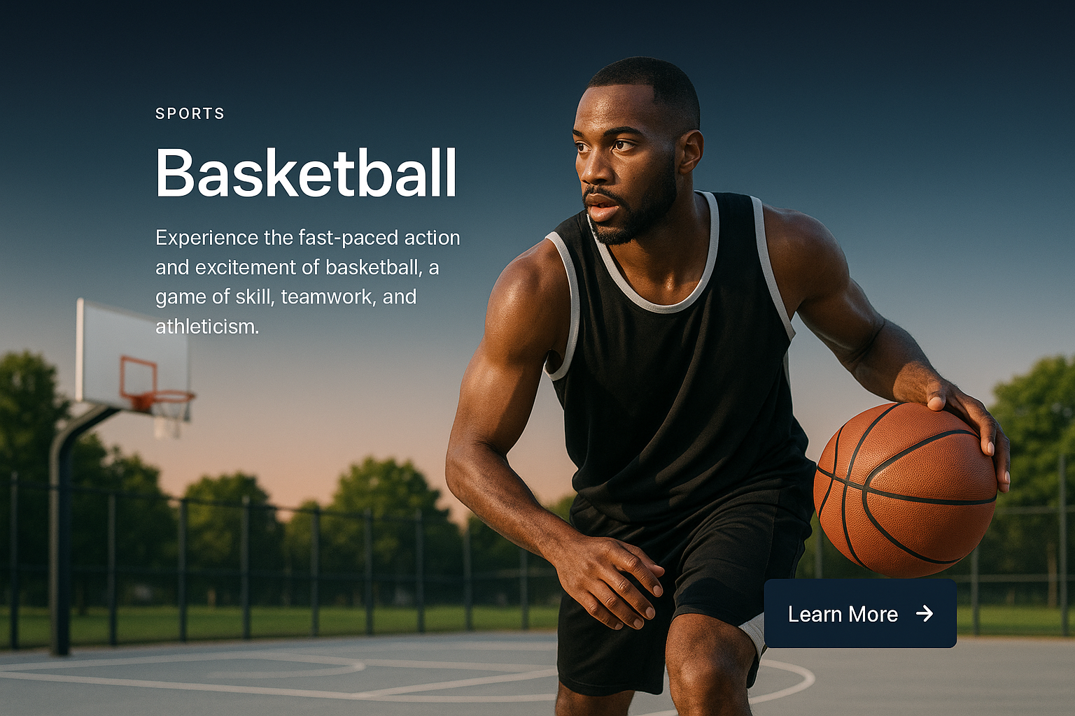 A dynamic basketball illustration featuring a player in action, set against a gradient background. The design includes a clear title and a call-to-action button.